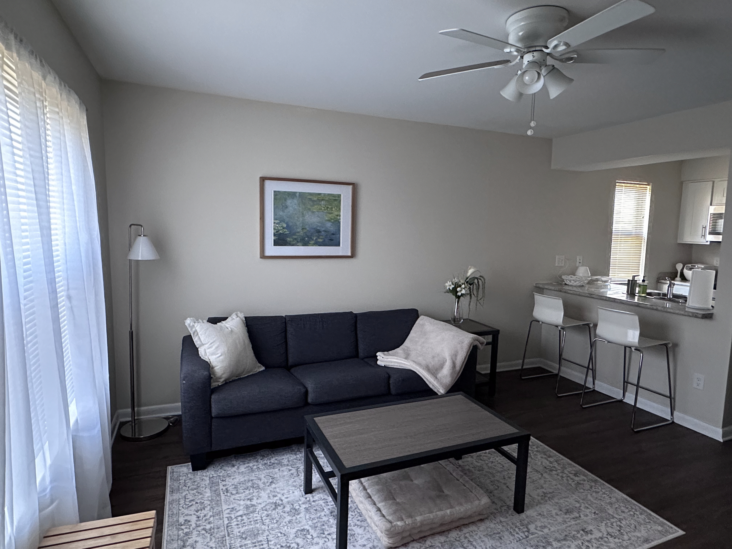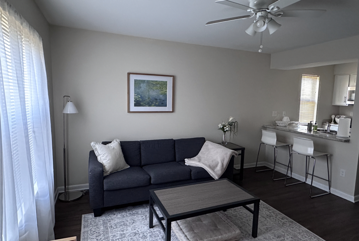 Bright 2nd floor corner unit near bus routes. New kitchen w/ glass-top electric stove & water filter. Furnished LR w/ 42-inch LG TV, barstools, rug & decor. Furnished BR with W/D and walk-in closet.