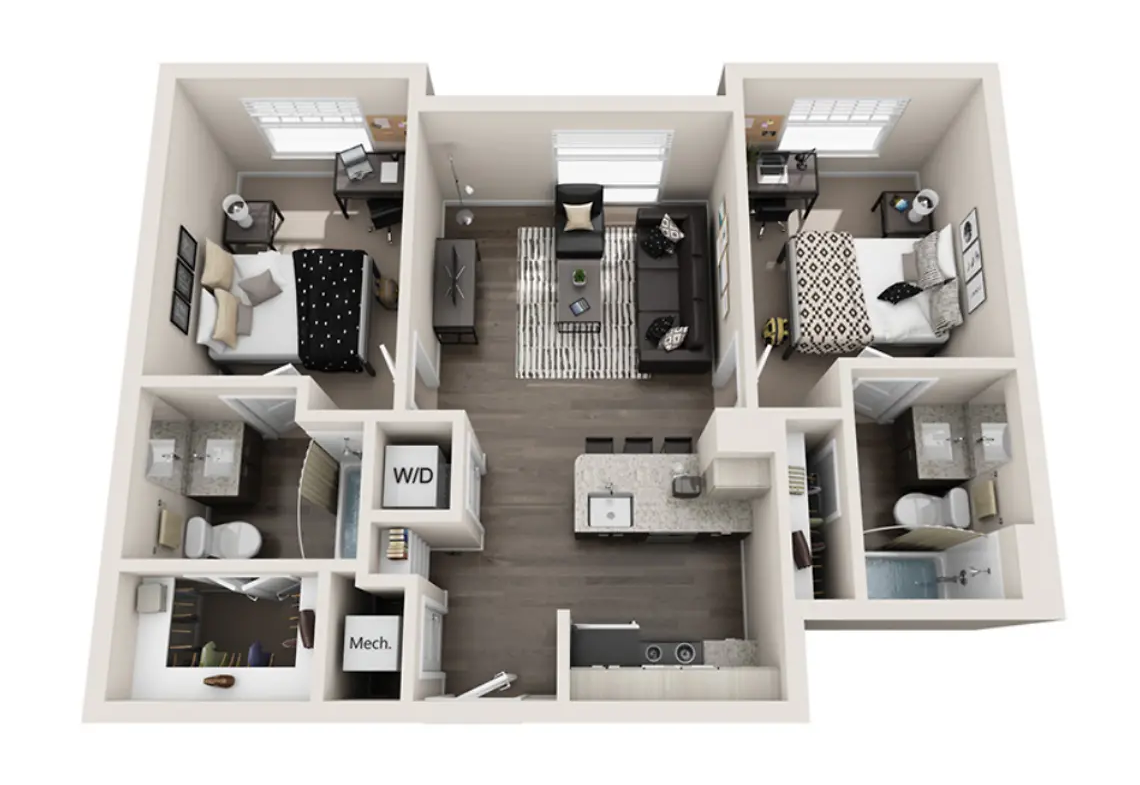 2 bedroom 2 bathroom apartment with a dishwasher, a washer-dryer, and furnished kitchen. Bedroom A is up for lease takeover. Bedroom B is currently occupied. The garbage disposal is on the same floor.